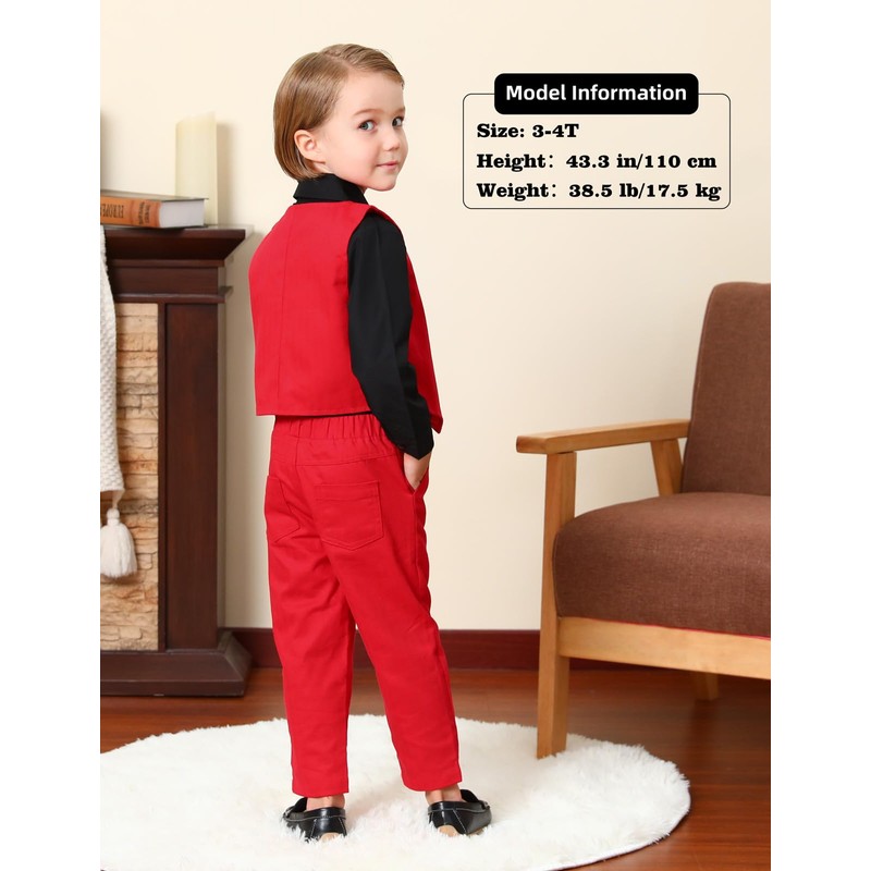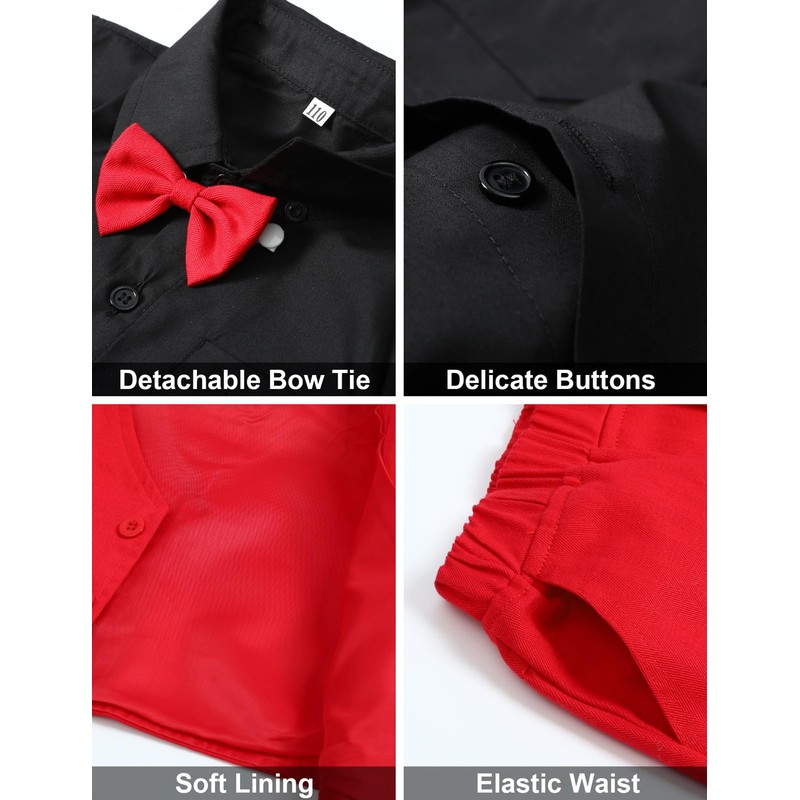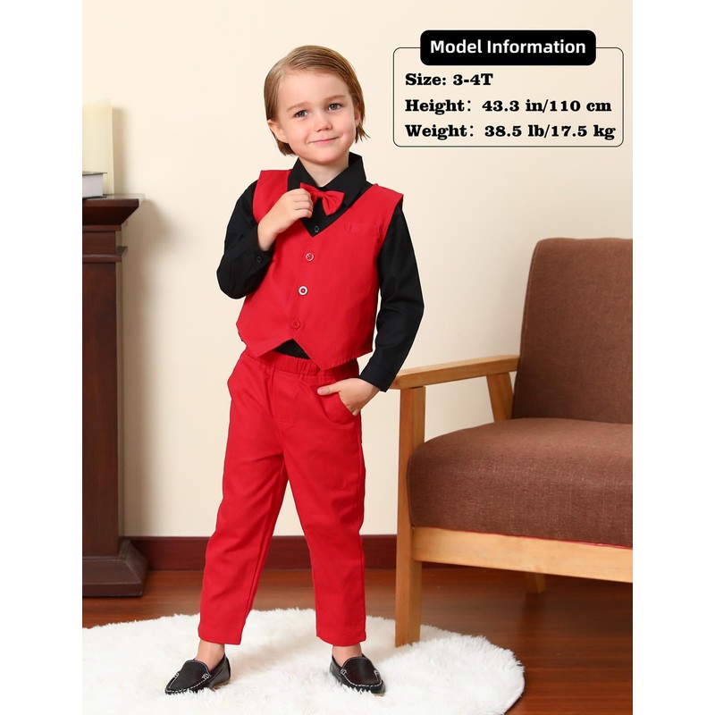 - The toddler suit with solid color design vest, pants, long sleeve white dress shirts and detachable bow tie.