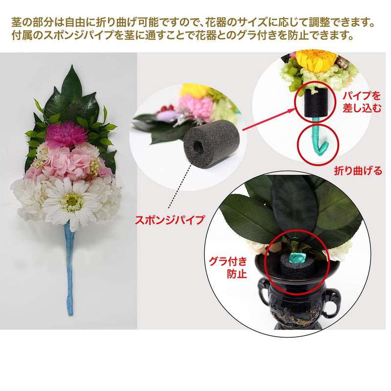 Each camellia leaf is carefully crafted to Sakakakaki, and it is luxurious with Gerbera and Hydrangea flowers, giving it a calming appearance that will be sure to fit any altar. You can also adjust the stem length to fit your vase (fold wire) Includes a sponge to prevent wobbling