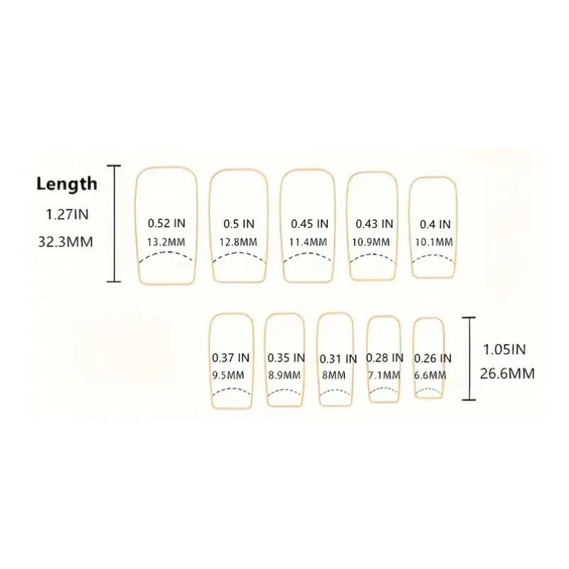 - 24-piece full cover press-on artificial nail set. Nails come carded and sorted by size for easier sizing and overall fit. Cards can be reused over and over again.