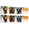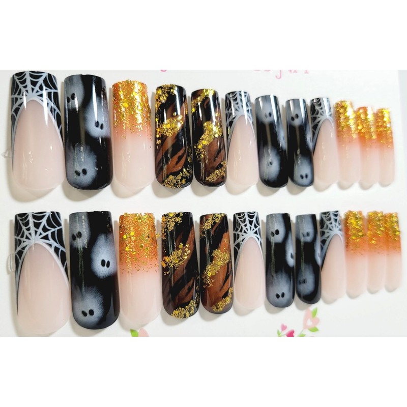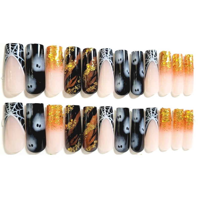 - These Halloween nails feature a long square base nail with all over patterns including cobweb french tips, ombre sparkle tips, ghosts, animal print with sparkle and more. There is a little bit of everything included in this set. Sure to be an attention getter.