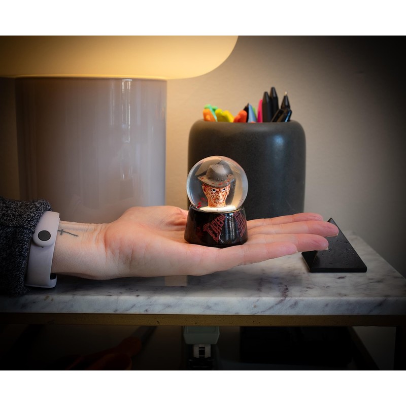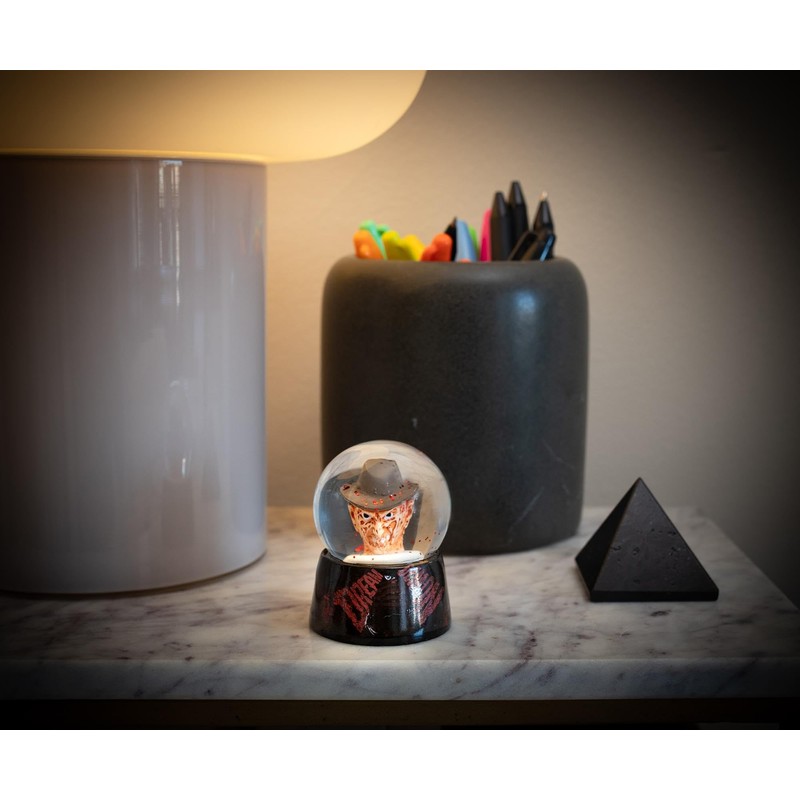 - Light up your fandom with this collectible snow globe! Featuring A Nightmare on Elm Streets' clawed killer Freddy Krueger, this 2-inch snow globe lights up with the flip of a switch! Batteries included. Officially licensed snow globe. Produced by Silver Buffalo, a trendsetting housewares and home decor company based in the heart of New York City.
