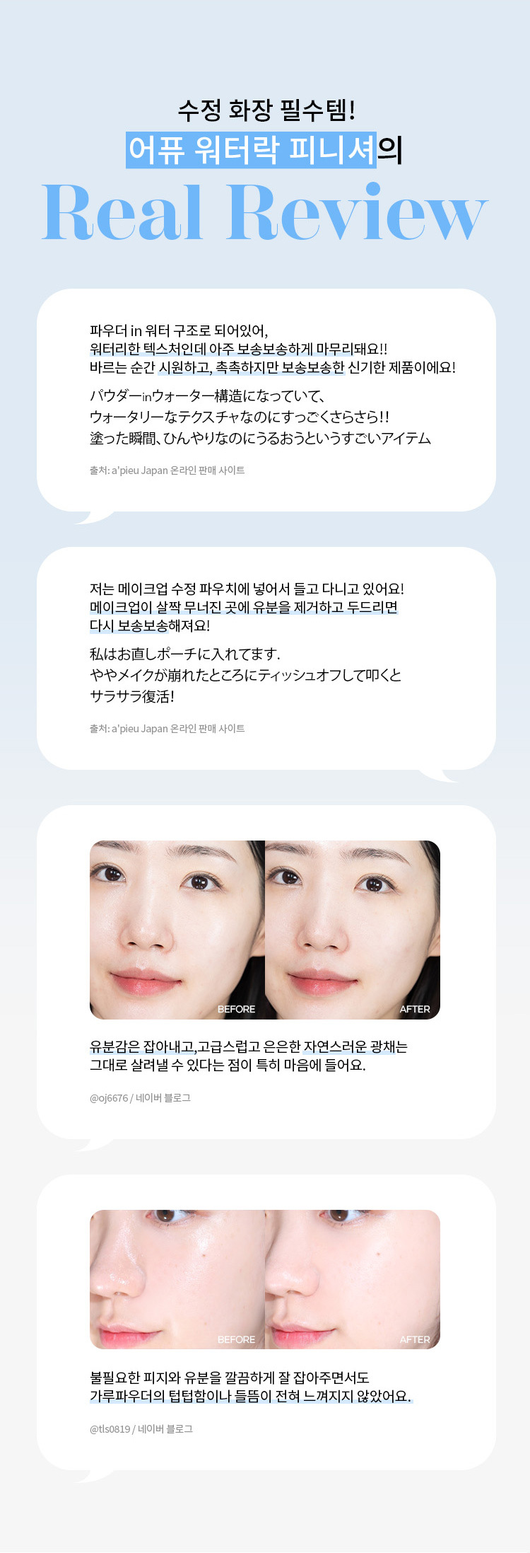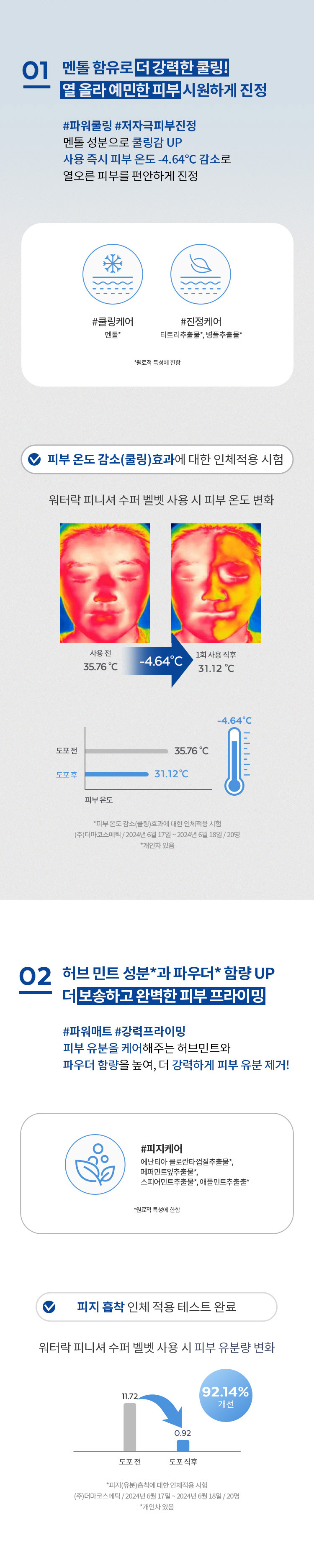 3-layer hyaluronic acid and bottle extract regulate the moisture on the skin surface for a long time, keeping it comfortable. Menthol works to cool and refresh. Herb & Mint extracts and richer powder perfectly erase the look of unwanted oil and shine.