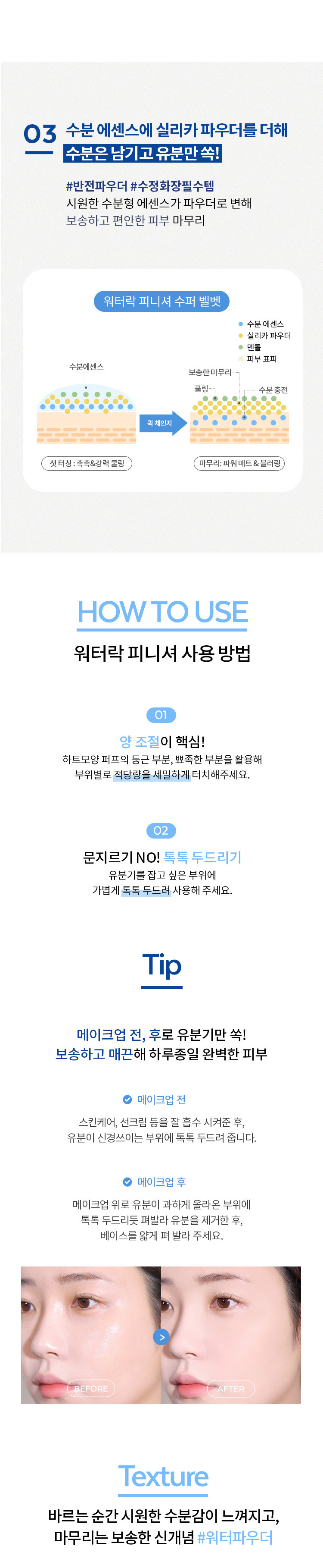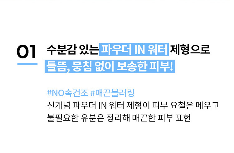 The innovative Powder-in-Water type formulation fills up the skin's moisture gap and controls unnecessary sebum, resulting in a smooth skin texture. A skin-cooling finishing powder that helps base makeup stay in place. The refreshing hydrating essence transforms into powder to give a soft and comfortable skin finish.