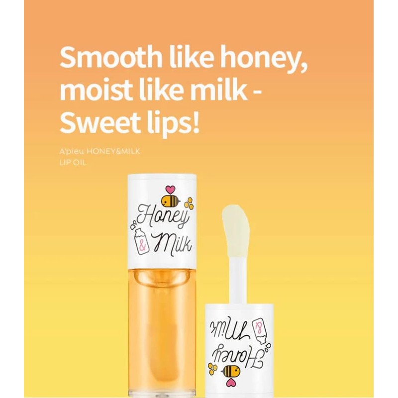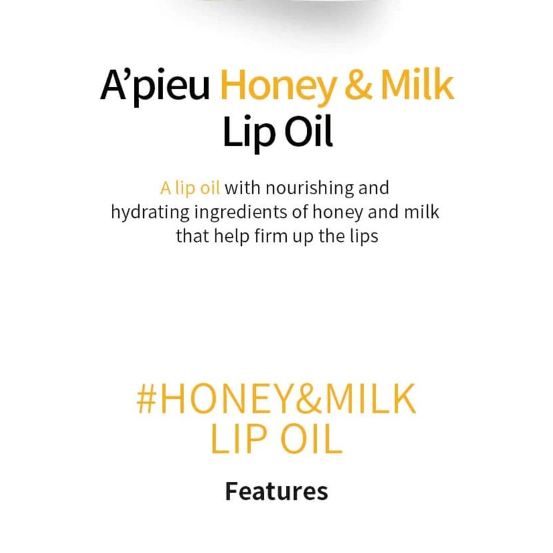 Honey and milk protein extract form a moisture barrier on lips to keep them smooth, firm and luscious. Details Product Information Made in:South Korea Imported from:South Korea Benefits: Lip oil infused with nourishing and moisturizing ingredients, including honey and milk to promote supple and resilient lips Locks in moisture and deeply hydrates lips for a long-lasting plump and glossy look! Carries a faint milk scent to lift your mood Great to use alone to make lips look naturally soft, or to top off lip tint for a glossy effect How to Use: Gently apply a layer on lips with the curved applicator. Reapply on troubled areas by tapping with the tip of the applicator. Alternatively, apply after lip tint. Size : 5g About brand: A'PIEU A sister brand of MISSHA and SWISSPURE, A'PIEU offers makeup and skin care formulated especially for young women in their 20s. The use of mild ingredients caters to sensitive skin, while collaborations with popular animated characters such as Doraemon, Crayon Shin-chan and Rilakkuma make its products more attractive to its audience. A'PIEU's most coveted products include the Pure Block Natural Daily Sun Cream, Start Up Primer and the Rilakkuma Edition product series.