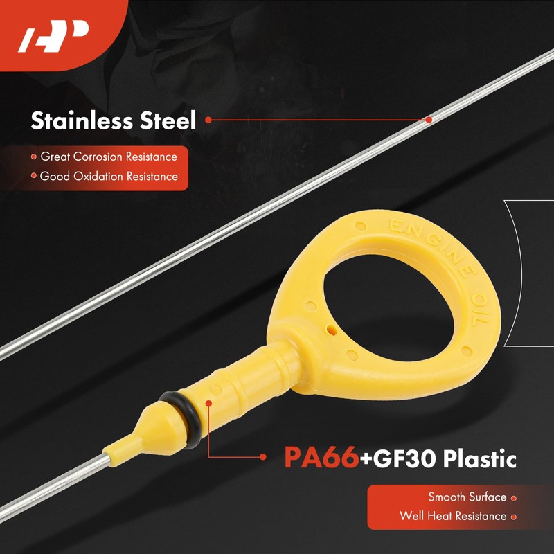 - [Specifications]: ①Part Type: Engine Oil Dipstick Replacement; ②Dipstick Material: Stainless Steel; ③Handle Material: PA66 + GF30 Plastic; ④Dipstick Length: 20.87 inch/53.0 cm (same as original oil dipstick); ⑤Total Length: 22.32 inch/56.69 cm; ⑥Fitment Type: Direct Replacement
