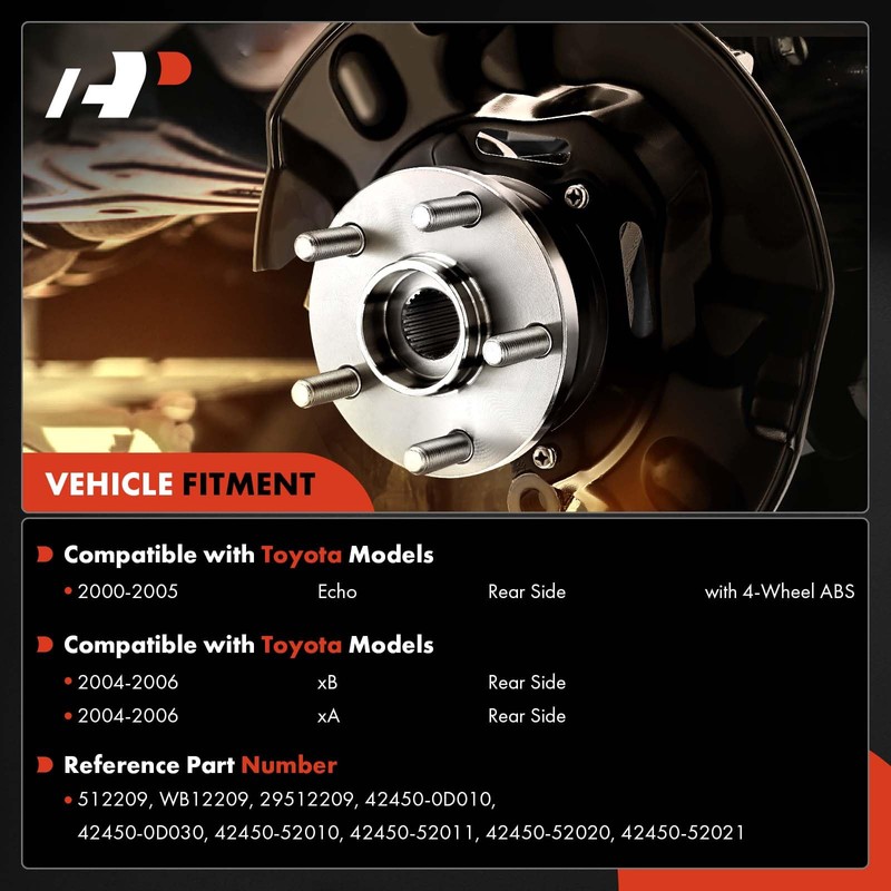 • [Specification]: ①Position: Rear Left and Right Side; ②Speed Sensor Included: Yes; ③Material: GCr15 Steel and 65Mn Steel; ④Wheel Stud Quantity: 4-Lug; ⑤Flange Type: with 4-Hole Flange; ⑥Axle Splines Type: Not Applicable; ⑦Pre-Greased: Yes; ⑧Reference Part Number: 512209, WB12209, 29512209, 42450-0D010, 42450-0D030, 42450-52010, 42450-52011, 42450-52020, 42450-52021