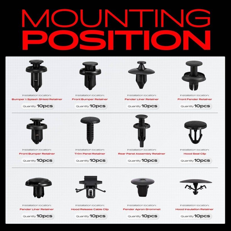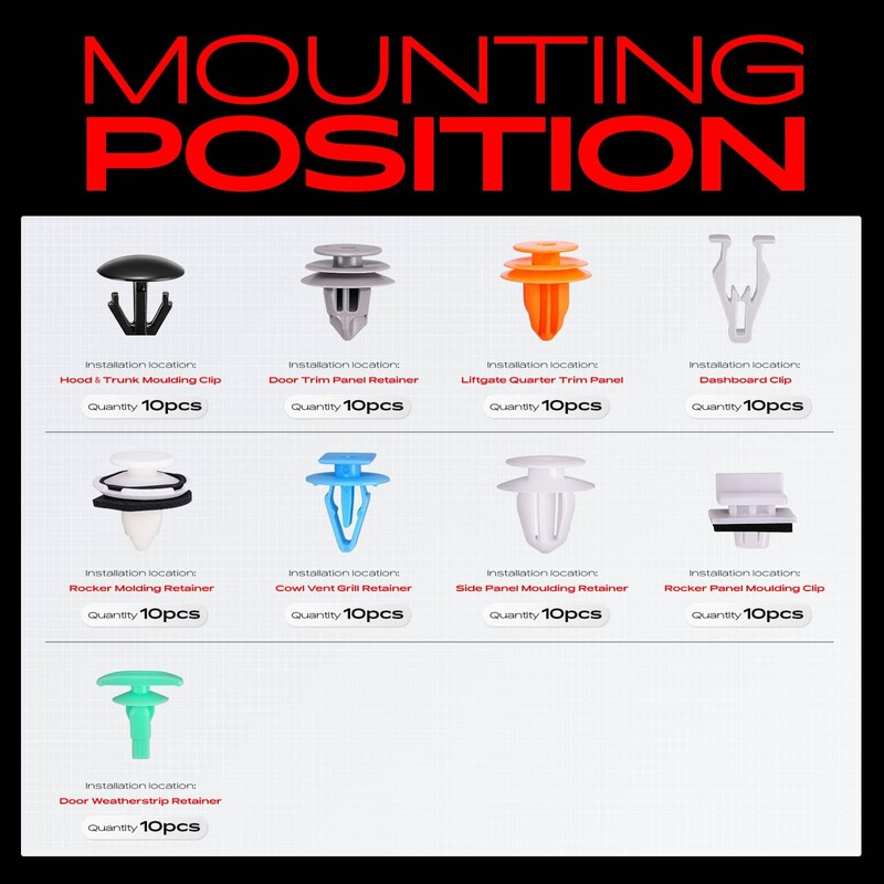 • [Vehicle Specific Kit]: Vehicle-specific fastener kits meet the need for fastener installation in multiple locations on a vehicle, eliminating the hassle of searching for individual parts - saving time and money. And the storage box is marked with the location of each fastener for easy identification and quick installation.