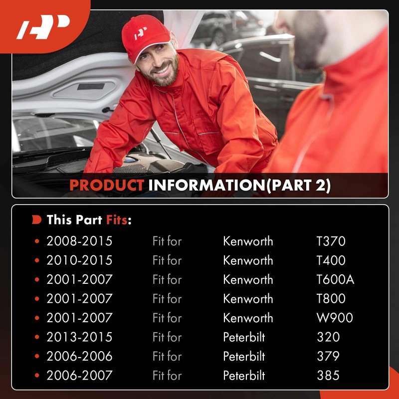 - [Vehicle Fitment]: Compatible with Kenworth C500 2000-2015, K100E 2001-2003/2005, K270 2013-2015, K300 2001-2005, K370 2013-2015, T170 2008-2015, T2000 2001-2011, T270 2008-2015, T300 2001-2008, T370 2008-2015, T400 2010-2015, T600A 2001-2007, T800 2001-2007, W900 2001-2007; Compatible with Peterbilt 320 2013-2015, 379 2006, 385 2006-2007