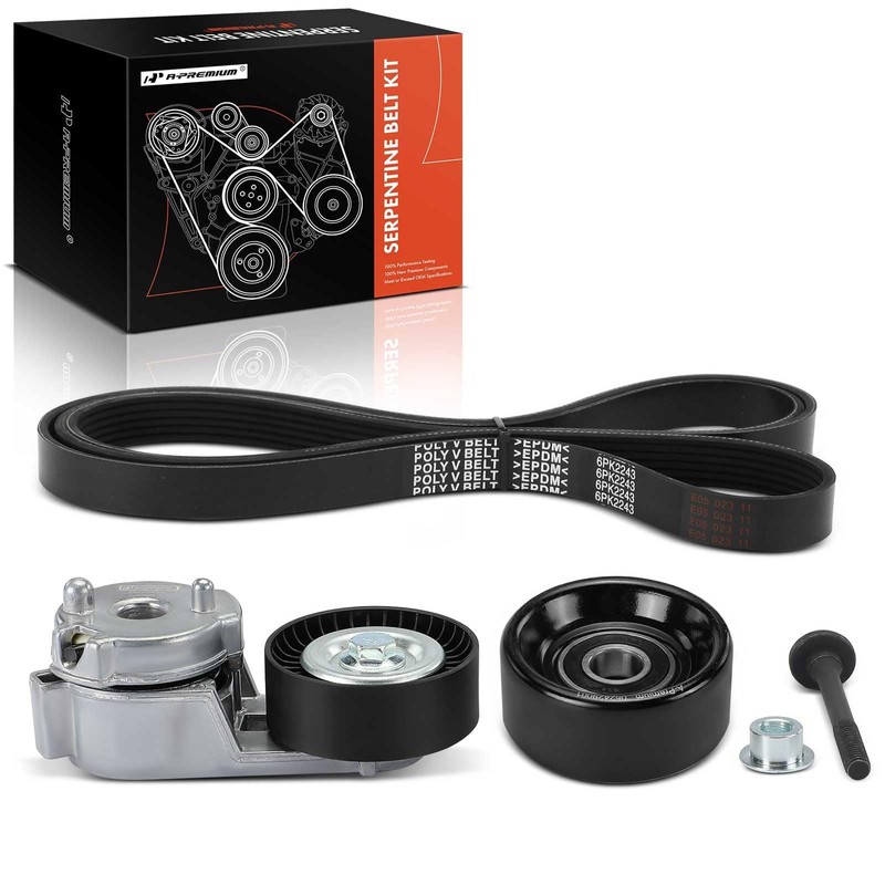 - [Functions]: A-Premium engine serpentine belt drive kit usually locates at the front of the engine and wraps around a set of sprockets. It ensures the connection between the camshaft and crankshaft, making the pistons and valves work together in the correct sequence. It will help the engine run normally, improve fuel efficiency, and thus effectively optimise the engine's performance.