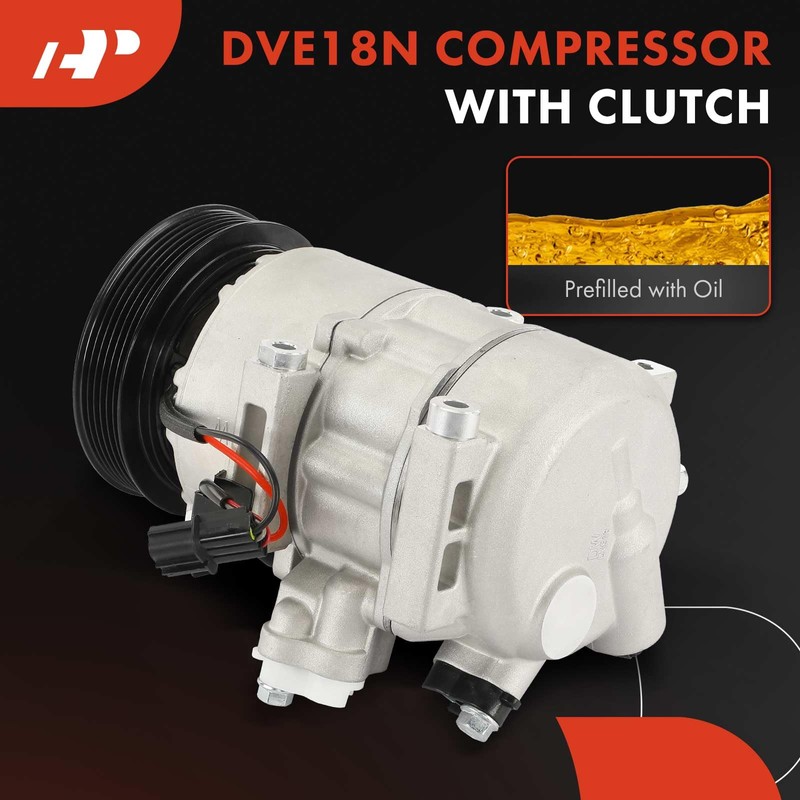 - [Specifications]: ①Compressor Type: DVE18N; ②Oil Type: PAG46; ③R-efrigerant Type: R134A; ④Pulley Grooves: 6; ⑤Clutch Included: Yess; ⑥Oil Prefilled: 150 ml (10 ml tolerance)