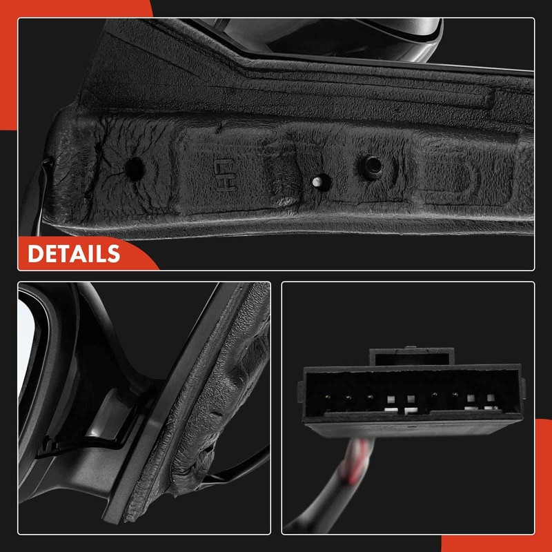 - [Specifications]: ① Position: Front Left Driver Side; ② Color: Black; ③ Glass Type: Flat; ④ Mirror Adjustment Method: Powered; ⑤ Foldaway: Yes; ⑥ Folding Type: Manual; ⑦ Turn Signal Indicator: No; ⑧ Blind Spot Detection: No; ⑨ Heated: Yes(Also fits Non-Heated); ⑩ Memory Recall: No; ⑪ Plug Configuration: 9 hole 5 prong