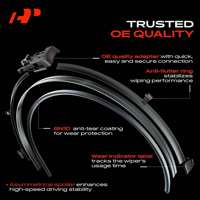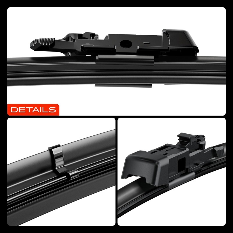 - [High-Performance Wiper Blade]: Featuring a dual-spring steel structure, constructed from high-tensile carbon steel, the windshield wiper blades maintain uniform pressure distribution across the entire glass curvature. This eliminates skipping/missed wiping caused by localized pressure points. The patented coating on the wiper blade ensures silent operation