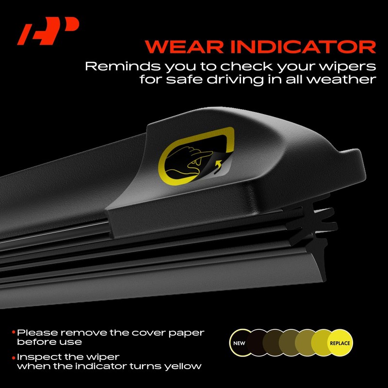 - [Color-Indicator Failure Safeguard]: The color-changing indicator label on the product's end connector enables visual aging assessment of windshield wipers, reducing maintenance complexity. When the label turns completely yellow, it indicates that the blade may need replacement based on actual usage conditions. The color conversion rate is related to usage frequency and operating environment