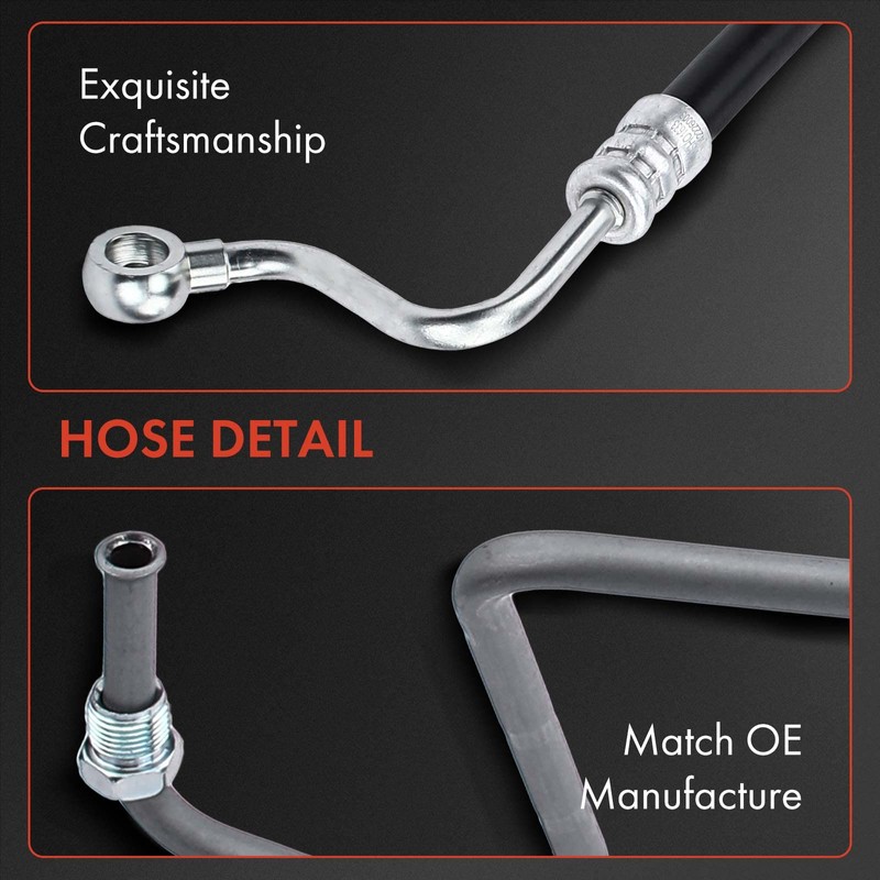 - [Leakage-Free]: A-Premium power steering pressure hose (aka "high pressure hose") is made of sturdy rubber and alloy, which shows good strength, toughness and is not easy to wear and break. The size, length and port of this power steering hose is the same as the original. After replacing the old, worn-out hose with this pressure tube, there's no more need to put up with annoying p/s fluid leak issues.