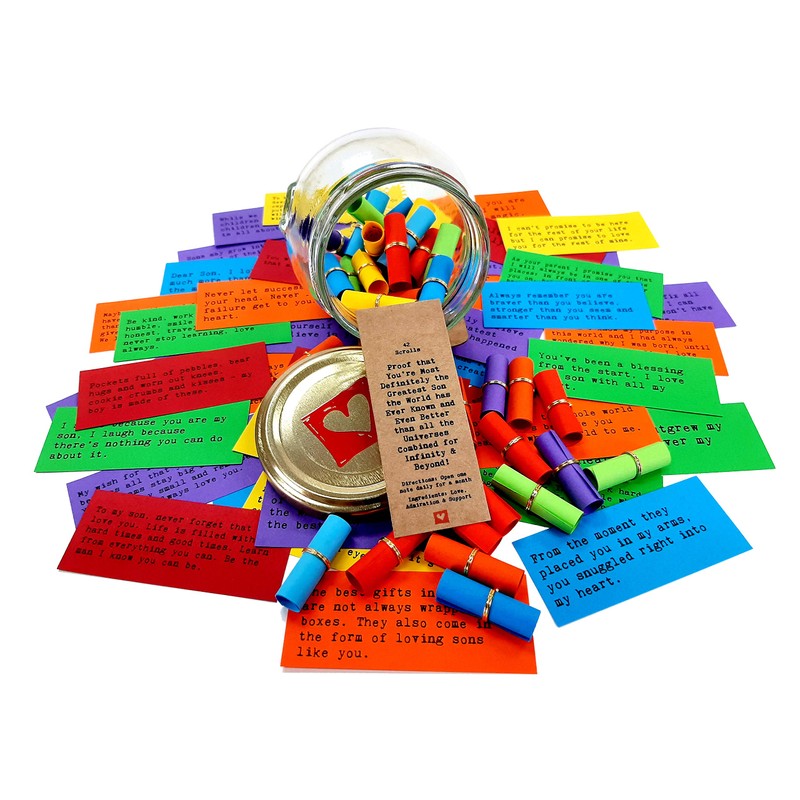 - Attentive: Show how caring you are with this touching gift that conveys your love and gratitude in small doses of beautifully presented notes in a jar. Such quotes can help rediscover simple truths of love and affection that we often neglect due to our busy lives. How else could you say "Proof that You're Most Definitely the Greatest Son the World Has Ever Known and Even Better than all the Universes Combined for Infinity & Beyond?