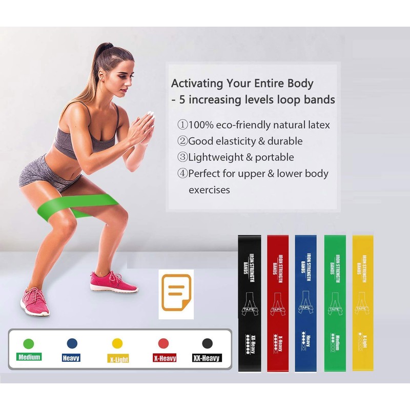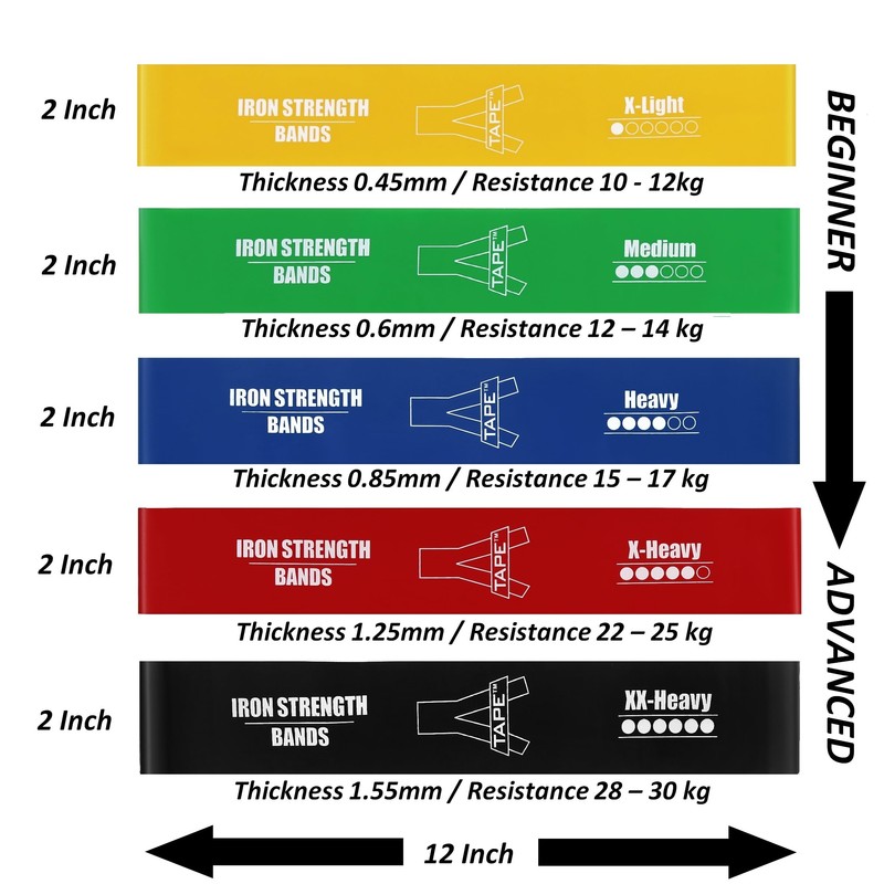 - High end exercise bands. Our 12″ by 2″ heavy duty loop resistance bands come in 3 Different resistance levels. This makes them perfect whether you are just starting to workout or a seasoned workout warrior. Our extra light and light bands are great for beginners, while our medium, heavy and extra heavy exercise bands are targeted for more intermediate and advanced strength training.