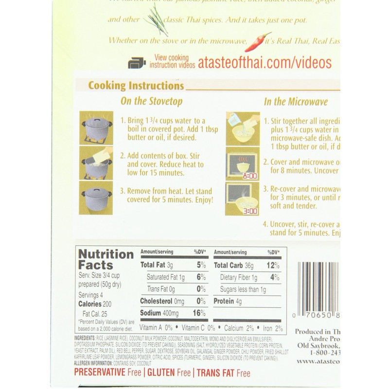 - ''' No preservatives, no trans fat, gluten free#||# Product of Thailand#||# Case of six 7-ounce boxes (total of 42 ounces)#||# Jasmine rice with coconut, ginger, and other classic Thai spices#||# No preservatives, no MSG; gluten-free#||# Prepare on the stovetop or in the microwave#||# Product of Thailand'''