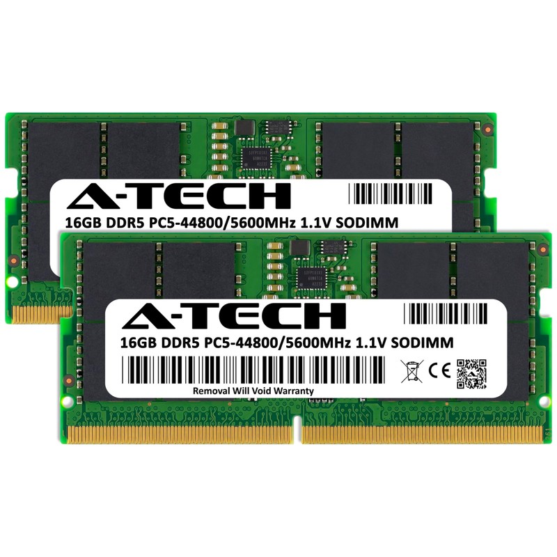 - 32 GB RAM Kit, (2 x 16GB Modules); DDR5 SO-DIMM 262-Pin; Speeds up to 5600 MHz, PC5-44800 (PC5-5600B)