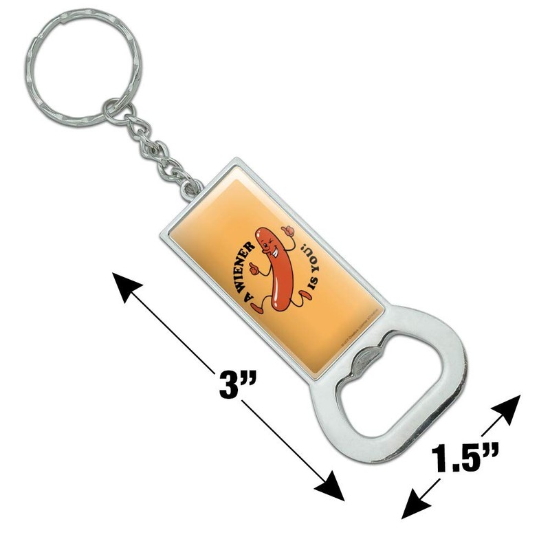 This A Wiener Winner Is You Hot Dog Funny Humor keychain is the perfect fusion of functionality and personality. In addition to keeping your keys safely in one place, this chrome-plated metal keychain features a working bottlecap opener on the opposite end. The printed design, on the other hand, adds some fun to the equation - and also features a resin coating for durability and a smooth plastic finish. The A Wiener Winner Is You Hot Dog Funny Humor keychain is approximately 3.0" (7.6cm) x 1.5" (3.8cm) in size.