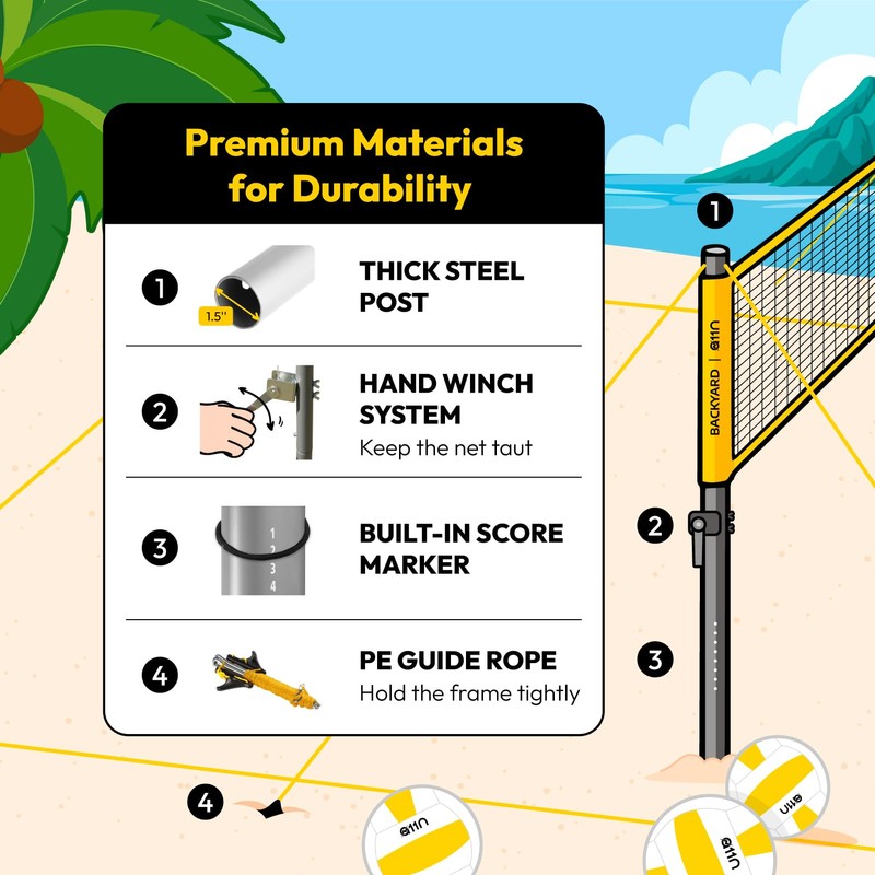 - Anti-Sag Net: Designed with a handle winch system, it’s easy to adjust the tension of the net keeping it tight and straight for each game.