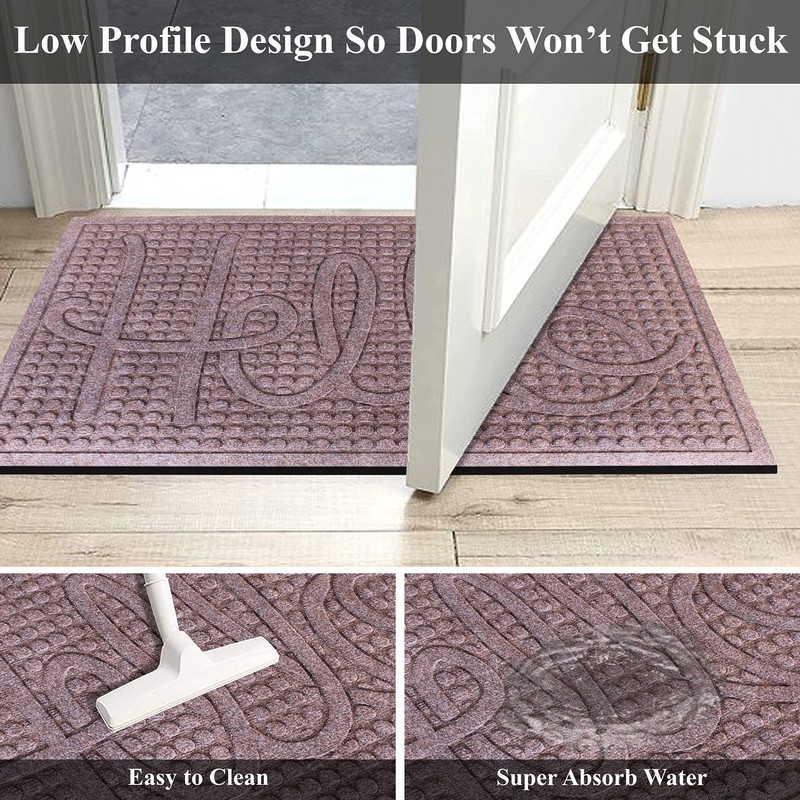 • ALL WEATHER DOORMAT AND WIDELY USE: Tough and long lasting construction is ideal for daily use in all weather,through snow,rain,leaves,pollen,mud,sand and more. The doormat is slightly raised beautifully woven polypropylene fabric helps to scrap off dirt,dust,grit, mud, sand,grass or snow and absorb moisture from shoe, help prevent everyday wear and tear. Widely used for home decor, front door welcome mat and kitchen rug, floor mat, back door, laundry, living room, and many more common areas!