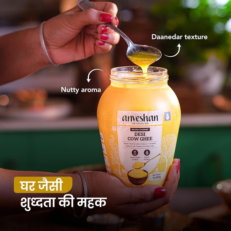 - MADE FROM CURD: Our A2 Desi Hallikar Cow Ghee is pure, additive-free, and cruelty-free. Fresh A2 milk obtained from Desi Hallikar cows is boiled and set to curd, the curd is then slowly hand churned bi-directionally in a wooden churner called a 'bilona'. The separated A2 butter obtained through this process is then slowly heated to obtain A2 Desi Hallikar Cow Ghee. This is why our A2 cow ghee has a grainy texture, thicker consistency, tempting aroma, and great flavour.