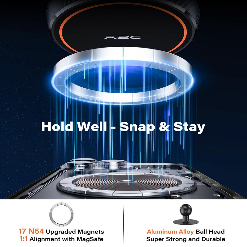 - Powerful magnetic hold - Snap your phone on and off effortlessly—no clips, no hassle. Built with 17 strong N54 magnets for a secure, reliable hold. Offers 1:1 Mag Safe alignment for iPhone 12–16 series, and works with all other phones using the included metal ring