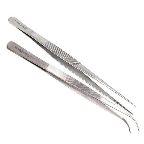 A2Z Cooking Tweezer Straight and Curved Tong Set, Tongs Precision Serrated Tips, Stainless Steel Professional Chef Tweezer Kitchen Tools for BBQ, Plating and Serving (Set of 2-8")