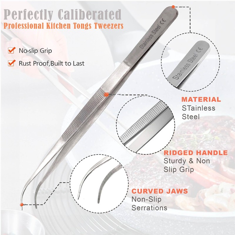 - ✅ Wide Applications –– Versatile and durable tool ideal for a wide range of applications including lifting, turning, and detailed food adjustment while maintaining the integrity of delicate ingredients during plating. Sitting on the countertops or next to your fine china, these stainless steel kitchen tweezer food tongs have almost surgical precision pretty good for getting to those fish bones.