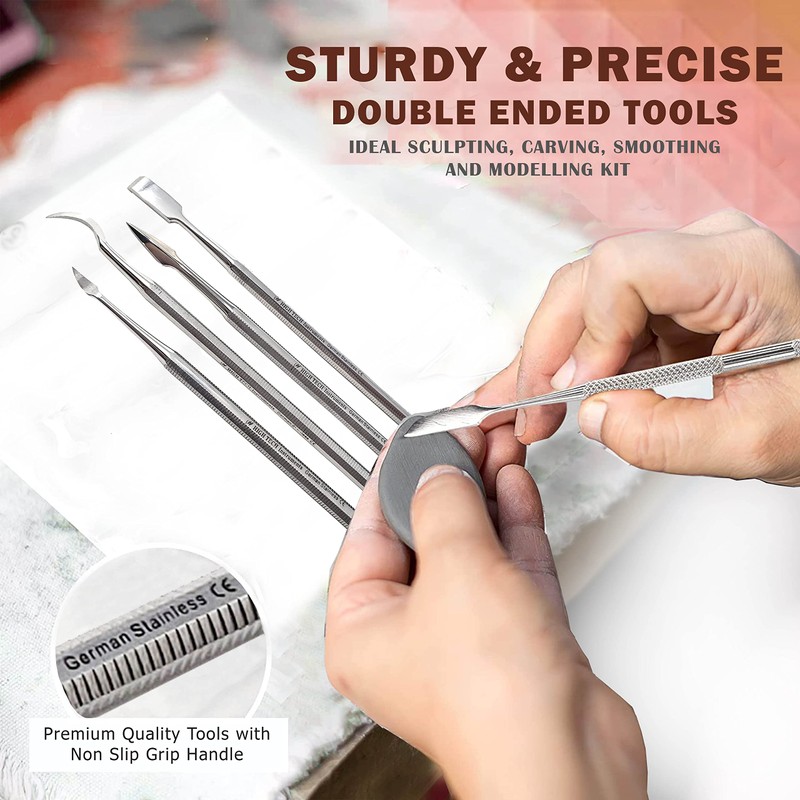 - ✅ COST EFFICIENT TOOL SET : This multipurpose set of tools is ideal for all your needs may it be carving, sculpting, shaping, modeling. This sculpting tool set contains all the accessories you need for your modelling projects and DIY crafts, including Probe, Scraper, Spatula, Chisel, Spearhead, Carver, etc. Essential supplies for styling, restoring, shaping, placing, cleaning. A great adition to your toolkit or Gift it to a friend who is a hobby enthusiast.