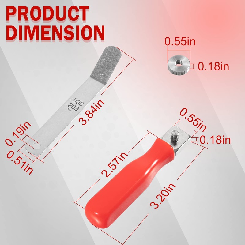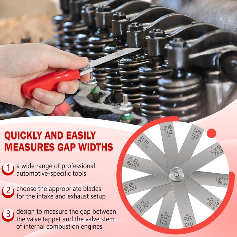 - 【Offset Blades for Easy Insertion】A308 tool set consists of 11 gauges of various sizes to choose the appropriate blades for the intake and exhaust setup, each gauge has an offset tip to allow the user to access and measure the clearance between the valve stem and tappet in tight spaces.