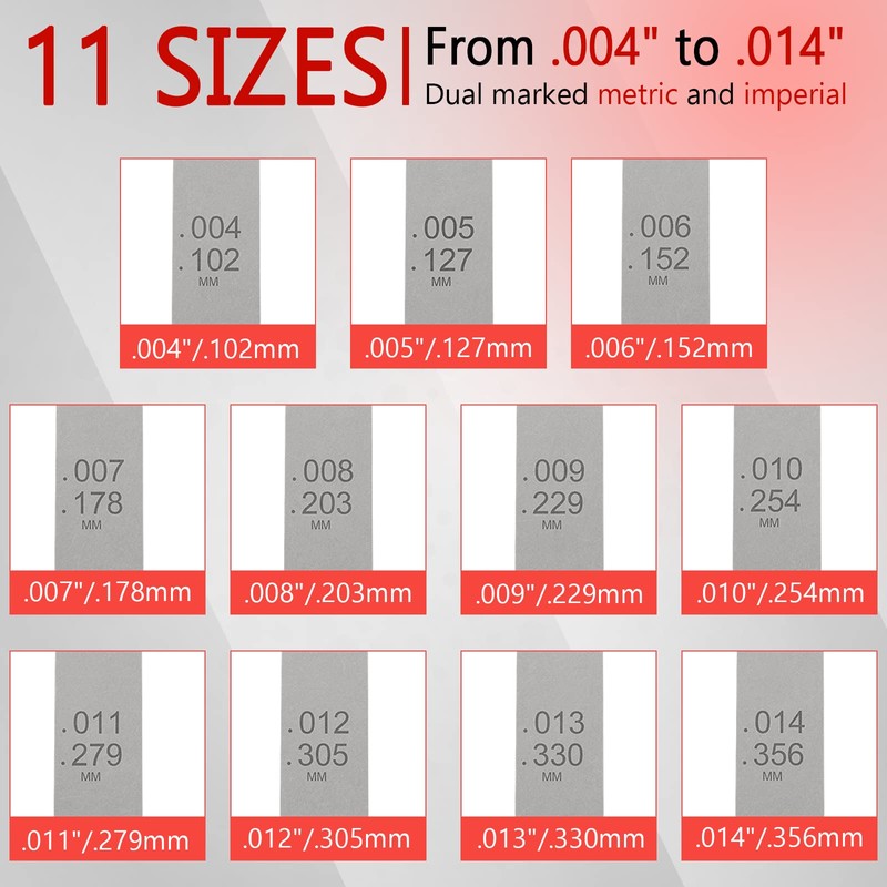 - 【11 Sizes From .004" to .014"】(.004"/.102mm), (.005"/.127mm), (.006"/.152mm), (.007"/.178mm), (.008"/.203mm), (.009"/.229mm), (.010"/.254mm), (.011"/.279mm), (.012"/.305mm), (.013"/.330mm), (.014"/.356mm)