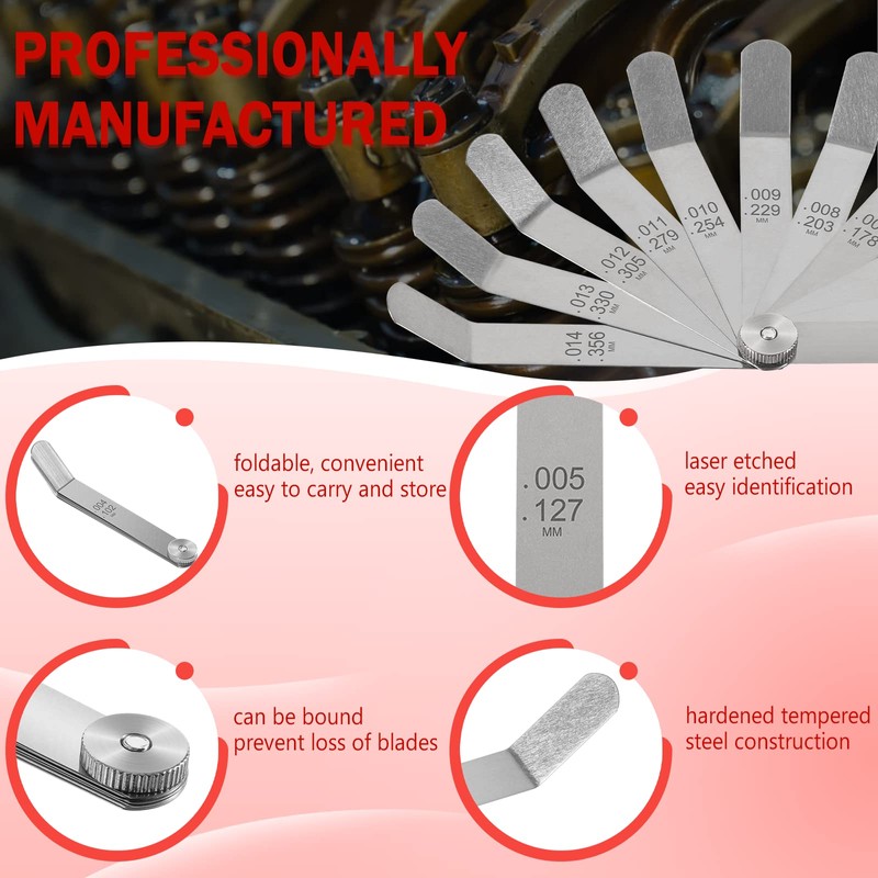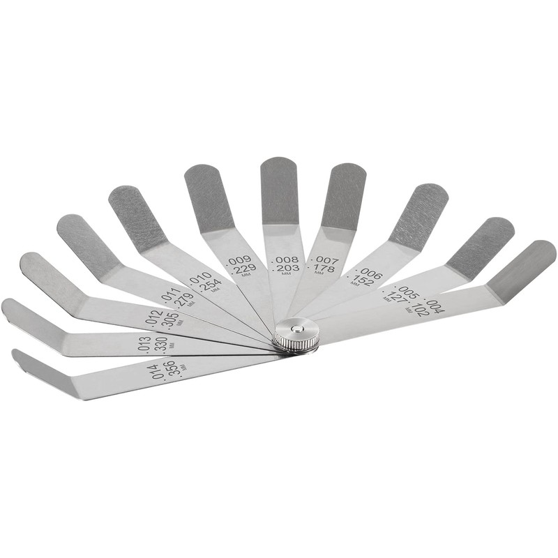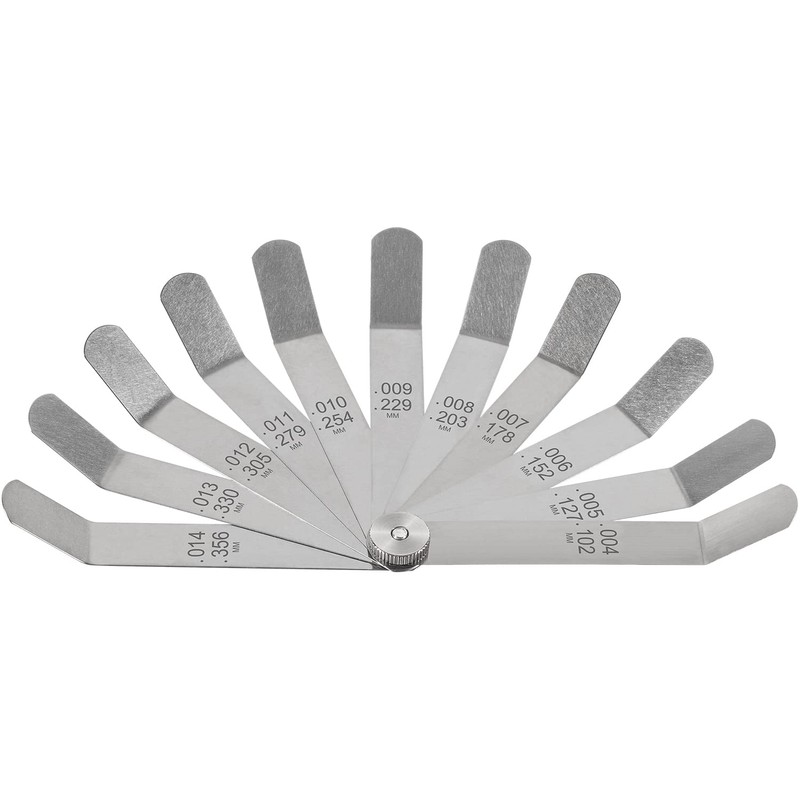 - 【Easy to Identify and Use】Foldable, easy and convenient to carry and store. 0.004"/0.102mm to 0.014"/0.356mm, dual marked metric and imperial, size numbers etched into feeler gauge for easy identification.