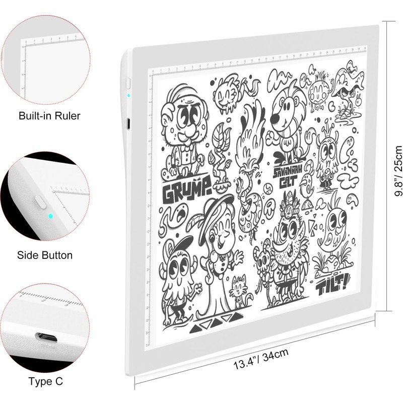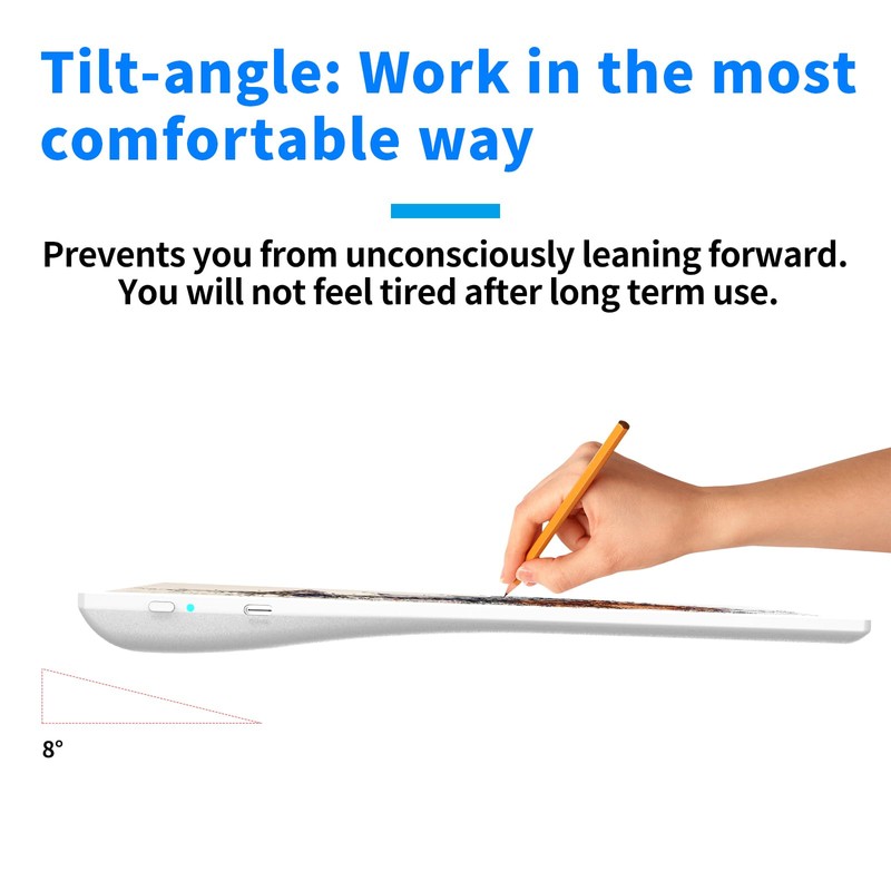 - 【 New Design Tilt Angle and Stable Magnets 】 The backside of light box tracer is of 8 degree tilt which is ergonomics and make you feel soft during long-time painting. 4 pcs magnets are provided for you to hold the paper on the surface of light box and keep it stable so that the LED lightboard for tracing is a perfect gift for kids women and artist friend.