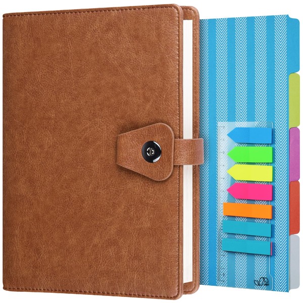 A5 Binder Journal, Refillable 6 Ring Organizer Planner Leather Business Writing Notebook, Ruled Hardcover Diary Notebook with Divider page and Index stickers-Brown