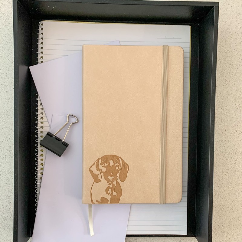 - SOPHISTICATED DESIGN INSPIRED BY DACHSHUNDS. Debossed image of a Dachshund on the front cover and a patterned design of dog silhouettes on the flyleaf. Straight spine for stability, tight binding so pages don’t fall out, and rounded corners that add to the elegant look.