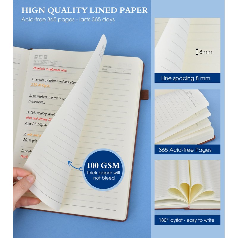 - 【365 Pages Premium Thick Paper】: Our PERCUN lined journal notebook is made of 365 pages high-quality 100Gsm thick ruled pager with an acid-free light Ivory paper that is thicker than normal. This premium quality paper will not cause bleeding, ghosting or smudging and is suitable for most types of pens,provides ample space for journaling, note-taking, and creative writing. The line spacing is 8mm, making it easy to write legibly and neatly.