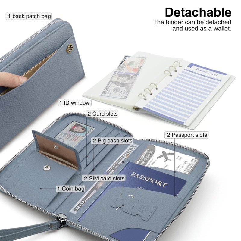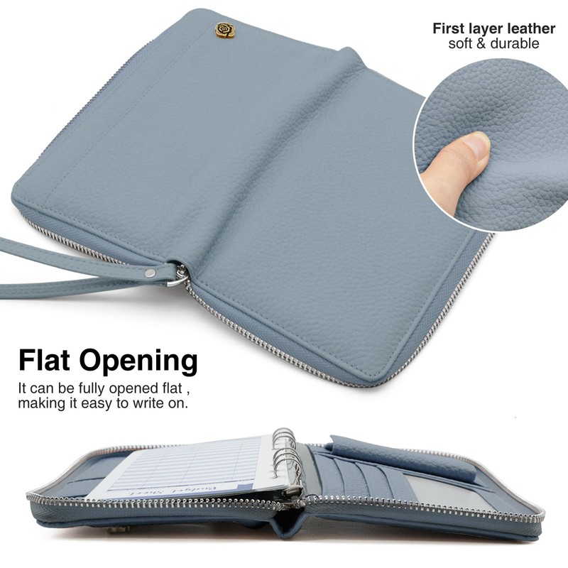 VLKAVIVA A6 Binder Cash Envelope System Wallet, Money Saving Budget Planner Notebook, 6 Rings Refillable Compact Cash Stuffing Binder, RFID Zipper Planner with Genuine Leather Cover (Blue)