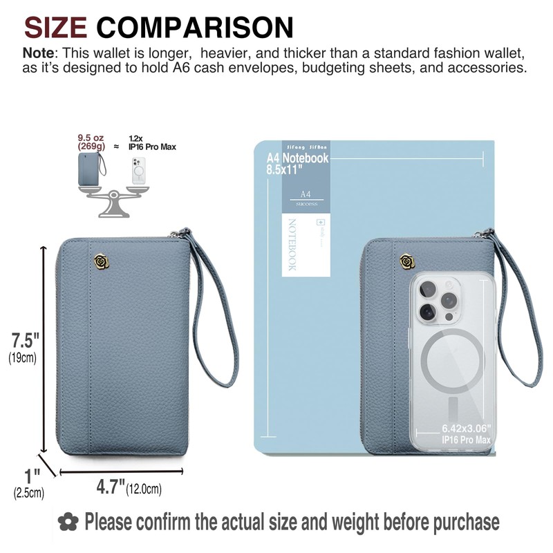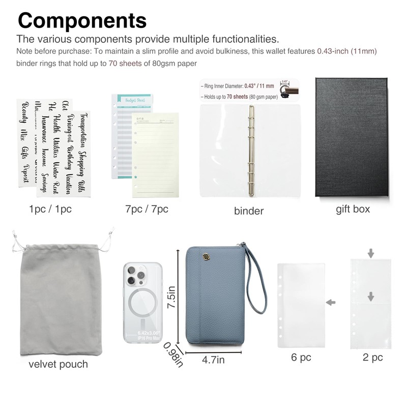- STYLISH BUDGET BINDER:Includes 1pcs genuine leather cover wallet (7.5" × 4.7" × 1.0"), 1pcs velvet drawstring bag, 2pcs transparent credit card holder booklets (holds 4 cards each), 6pcs A6 cash envelopes, 7pcs budget sheets, 7pcs horizontal record pages, and 2pcs sheets of English letter sticker labels. Perfect for organizing money, expenses, and savings