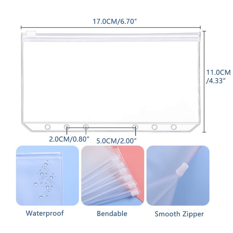 - PRODUCT SPECIFICATION---Size: 19.0*28.0CM / 7.50" *11.02", Package Included: 1 PC* PU A6 Binder Notebook, 12 PCS* Transparent Zipper Bags.