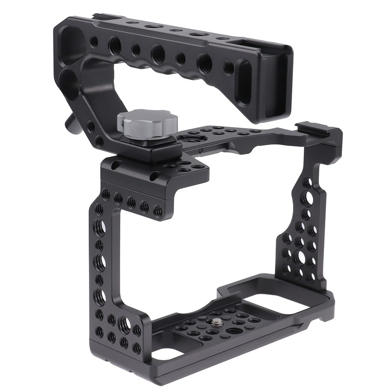 • The top handle is designed for handheld shooting, can hold the weight of a large cage rig with various attachments with ease.