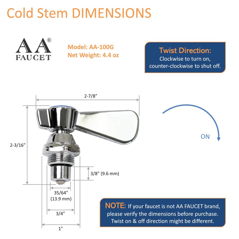 Commercial cold stem assembly with handle for AA Faucet Excellent engineering design Replacement for commercial duty faucet Polished chrome finish B-handle with Blue index For AA Faucet 700 Series 8" faucets, NOT for other brands or models, Not for 4" Hand Sink Faucet