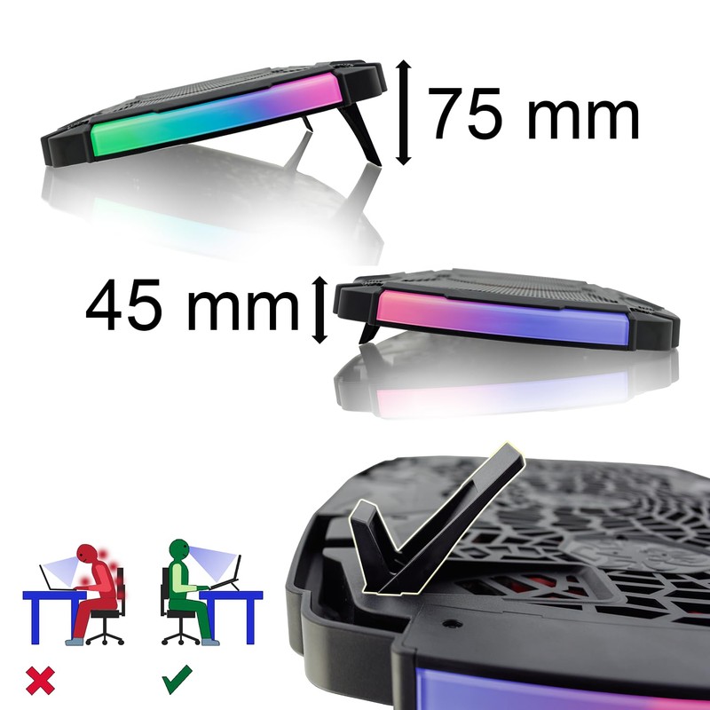 - Increase cooling flow and efficiency: laptop pad fans direct cool air from the bottom of the case to the entire laptop. This makes it possible to lower the temperature of the case as well as the CPU and GPU core and thus gain additional FPS
