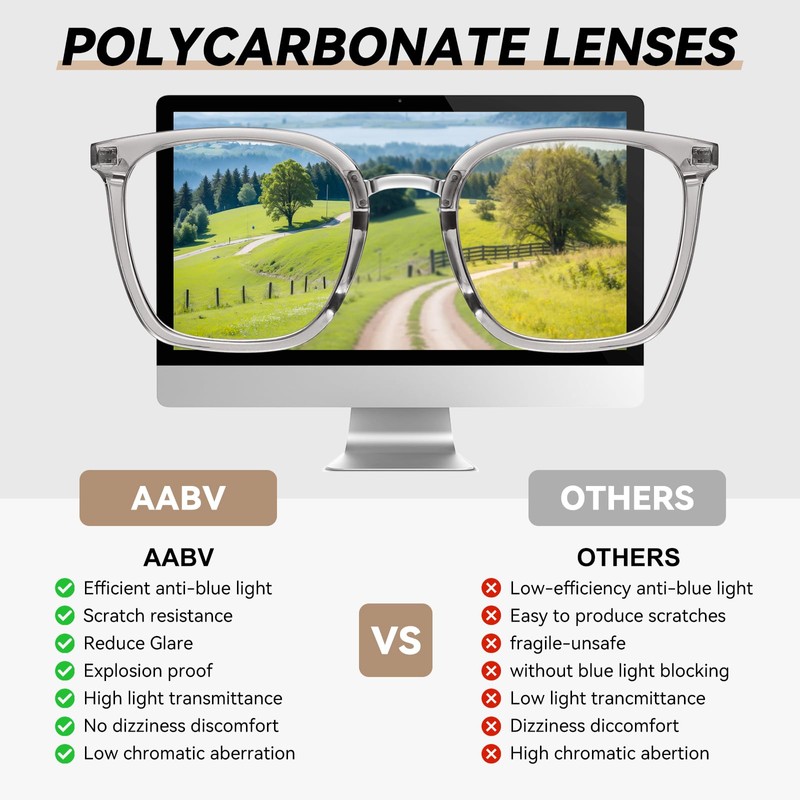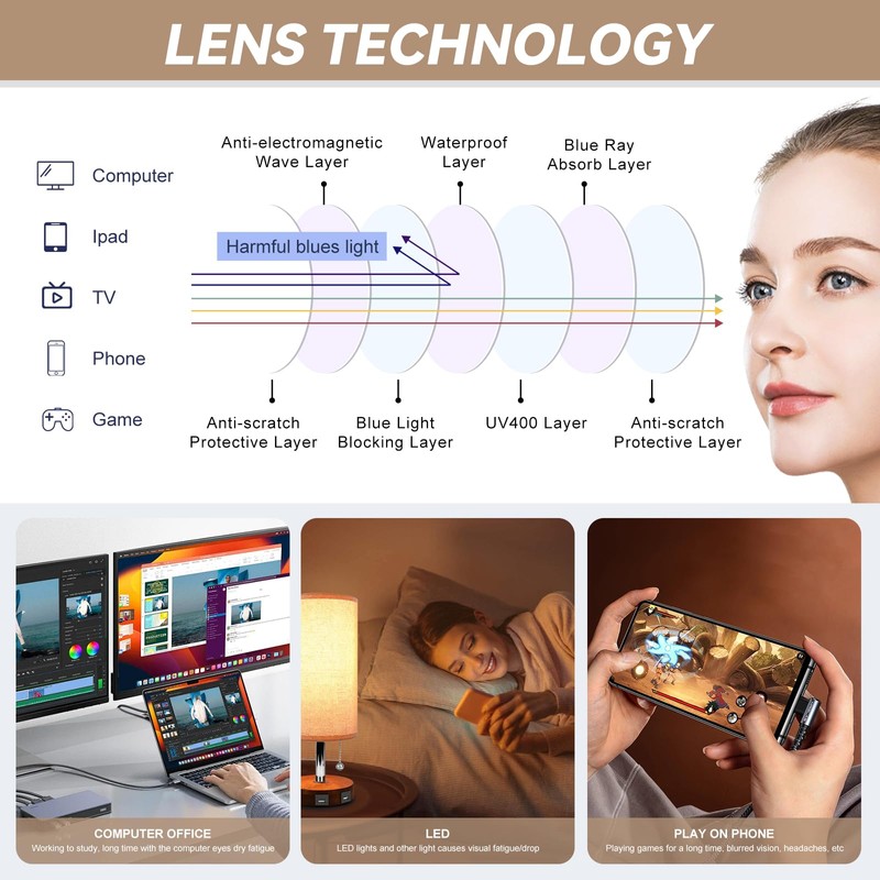 - Blue Light Blocking:Anti blue light and UV400 lenses can effectively anti reflective and improve eyes healthy degree.Relive your discomfort when watch tv, mobile phone screen and computer.Provide long-lasting protection for your eyes.