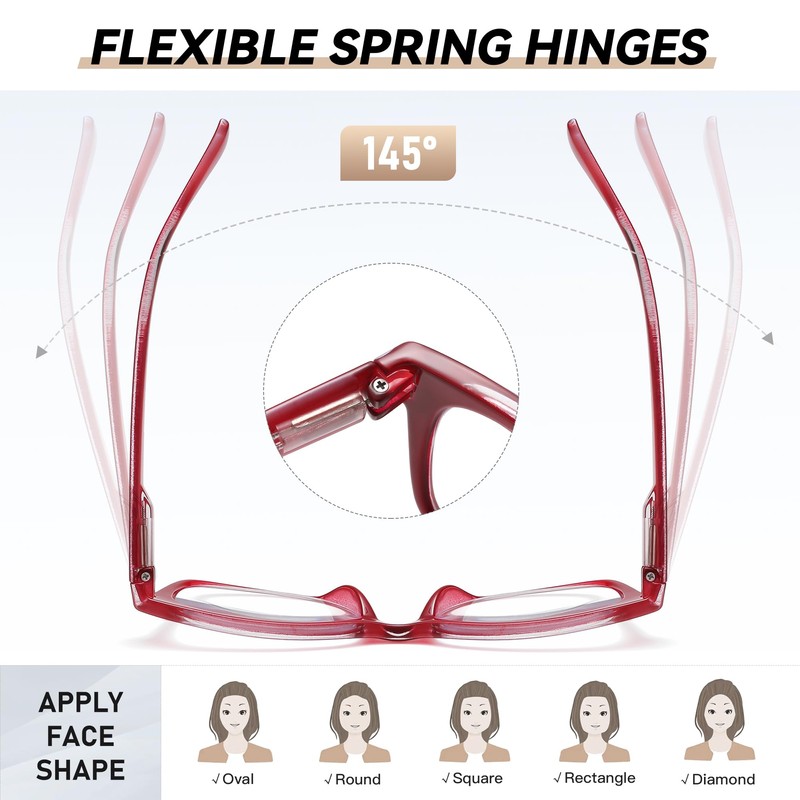 - COMFORTABLE AND LIGHTWEIGHT:AABV Reading glasses design based on most of women's facial features,one-pieced nose pad is no pressure for your nose,so that it will not destroy lady's mukeup.Wearing long time you won't feel tired and pressure.spring-hinged temples can open 25° outward to accommodate any face shape.