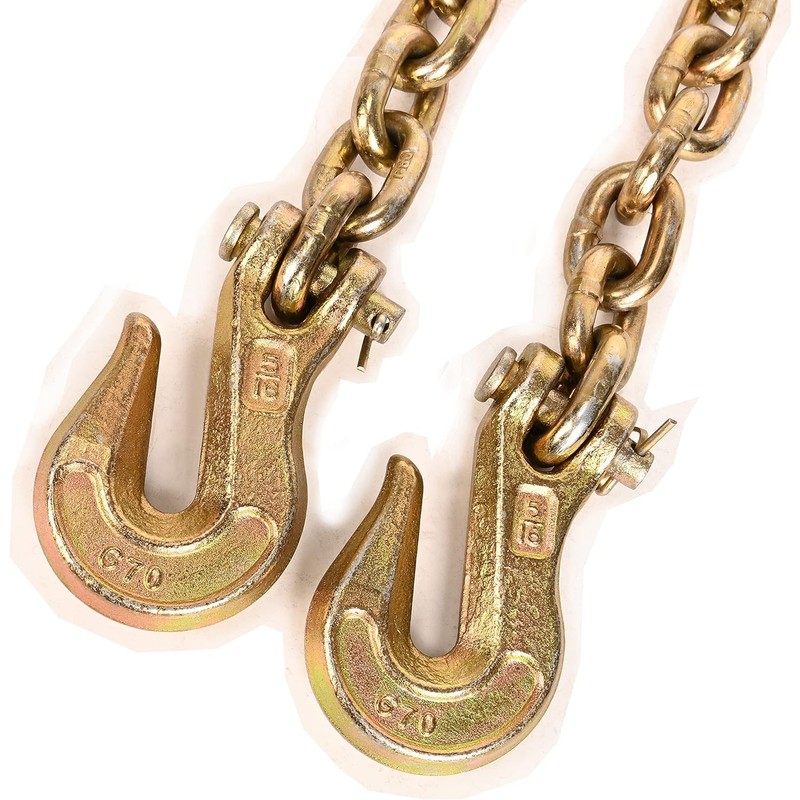 - [EXCELLENT CHAINS] G80 heavy duty towing chain with clevis grab hooks provide a higher safe working load than lower grade chains, but weigh the same. Our transport binder chains can stay attached to the ends of your chain, but can also be removed if needed.