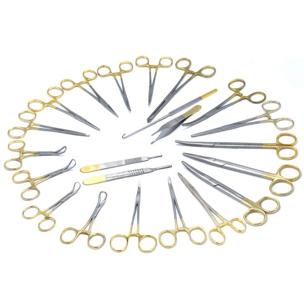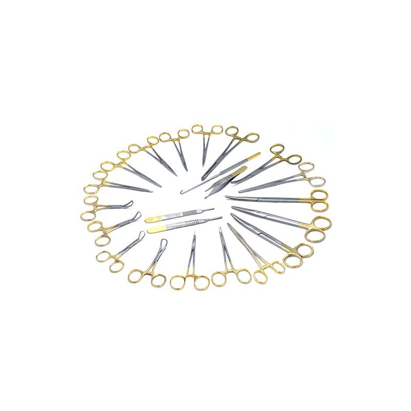 Item: AAProTools-gold Premium German Grade 82 Pcs Veterinary Instruments Set -include Kelly Forceps- Mosquito Forceps -carmalt Forceps -backhaus Towel Clamp- Mayo Metzenbaum Scissors- All In One -surgi Dental Instrument Set Set Includes: 1 O.r German Grade Olsen Hegar Needle Holder 5.5" ( Gold ) 1 O.r German Gold Handle Carmalt Artery Forceps 6.25" Straight 1 O.r German Gold Handle Carmalt Artery Forceps 6.25" Curved 1 O.r German Grade Allis Tissue 4x5 Teeth 7" ( Gold ) 4 O.r German Grade Backhaus Towel Clamp 3.5" ( Gold ) 1 O.r German Grade Scalpel Handle #3 ( Gold ) 1 O.r German Grade Scalpel Handle #4 ( Gold ) 1 O.r German Grade Mosquito Hemostat Forceps 5" Straight ( Gold ) 2 O.r German Grade Mosquito Hemostat Forceps 5" Curved ( Gold ) 2 O.r German Grade Kelly Hemostat Forceps 5" Straight ( Gold ) 2 O.r German Grade Kelly Hemostat Forceps 5" Curved ( Gold ) 1 O.r German Grade Snook Overiectomy Hook 8" ( Gold ) 1 O.r German Grade Metzenbaum Scissors 9" Curved ( Gold ) 1 O.r German Grade Mayo Dissecting Scissors 6.75" Straight ( Gold ) 1 O.r German Grade Mayo Dissecting Scissors 6.75" Curved ( Gold ) 1 O.r German Grade Adson Brown Forceps 4.75" Serrated ( Gold ) 20 Surgi Sterile Blade #10 20 Surgi Sterile Blade #11 20 Surgi Sterile Blade #22