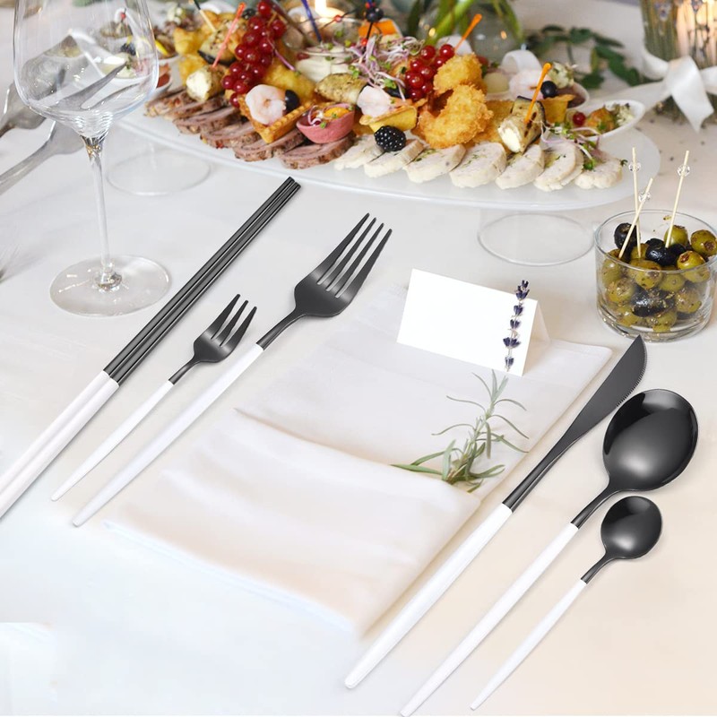 AARainbow 8 Pieces Stainless Steel Flatware Set Portable Reusable Cutlery Set Travel Utensils Set Including Chopsticks Knife Fork Spoon Straws Cleaning Brush Dishwasher Safe (White black)