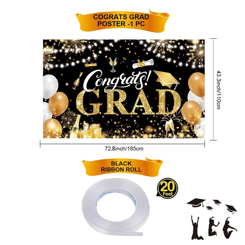 - Large Banner Size - The graduation backdrop size is 72.8x43.3 inch, this must be eye-catching at a graduation party. And the elegant black and gold happy graduation banner is perfect for adding extra flair and to high school or college graduation party decorations 2025.