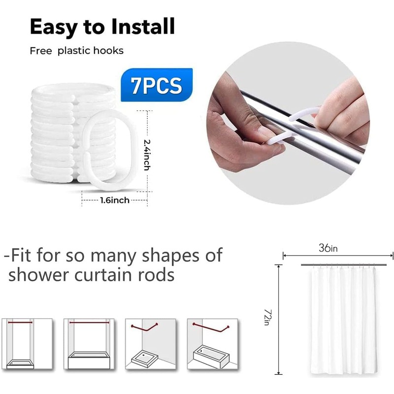 - In The Package: One 36 inch width x 72 inch length shower curtain with seven hooks